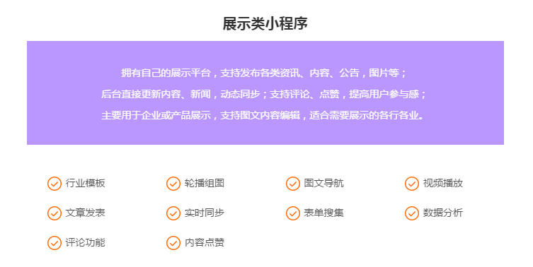 现已上线电商、点餐、票务.活动.预定和展示类4种小程序解决方案。功能齐全且简单易用,操作界面清晰明了,只要会打字和计算机简单操作,即可轻松创建您的专属小程序。更多解决方案持续更新中......